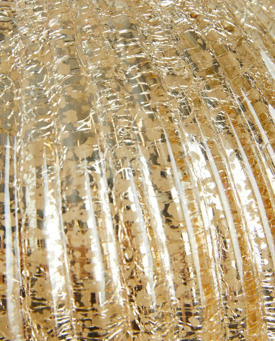 Glass Christmas bauble decoration with a striped texture, a shiny effect and a velvet bow detail at the top.