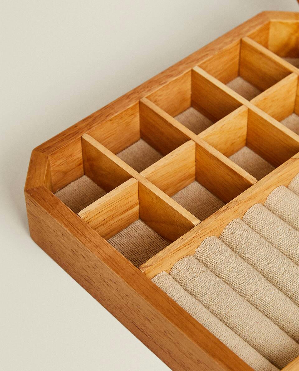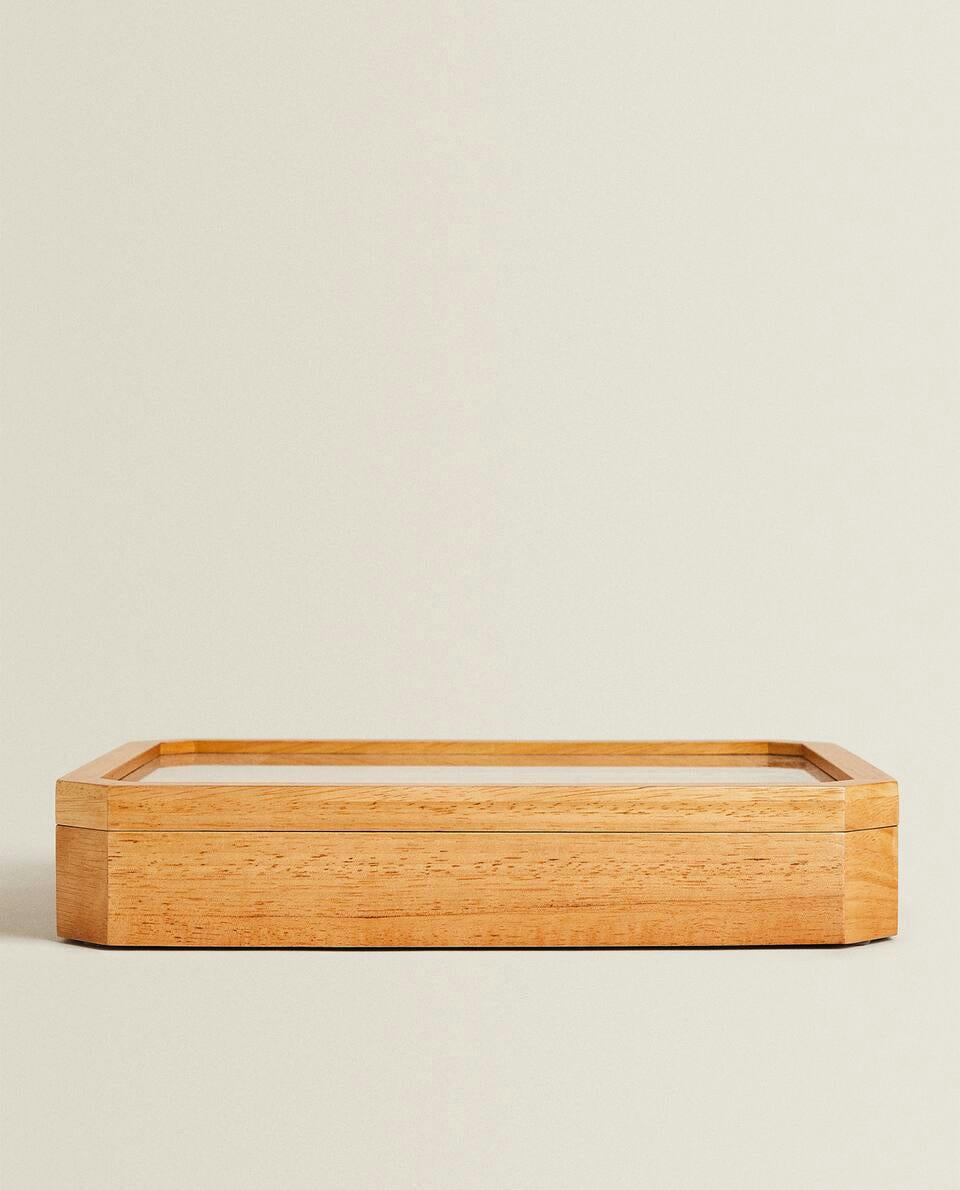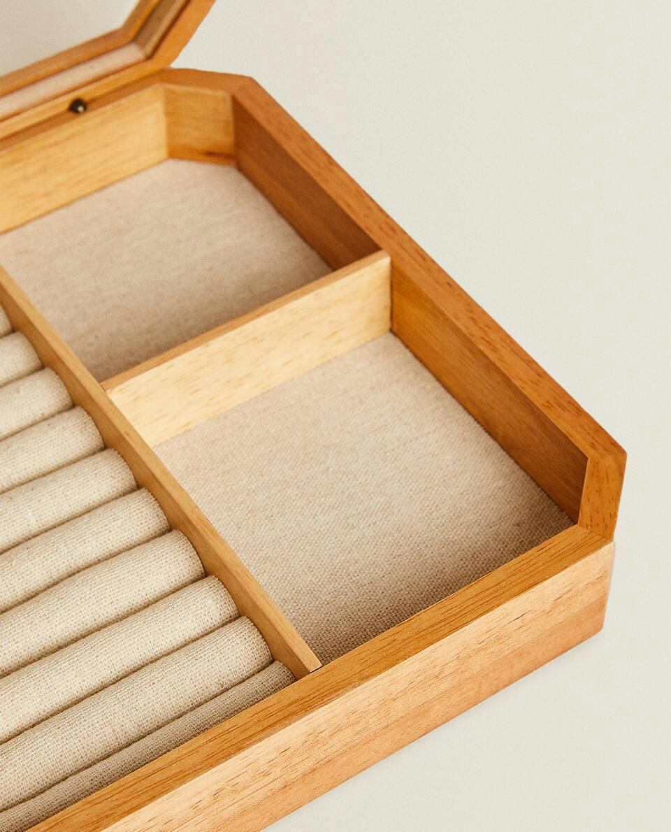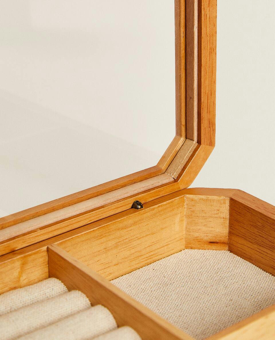 Wood and crystal jewellery box with lid. Featuring different inside compartments for earrings, rings, brooches and bracelets.