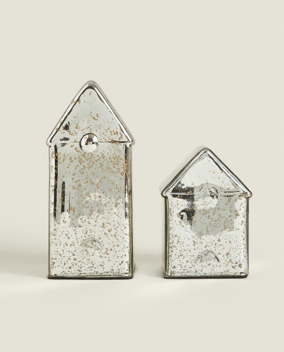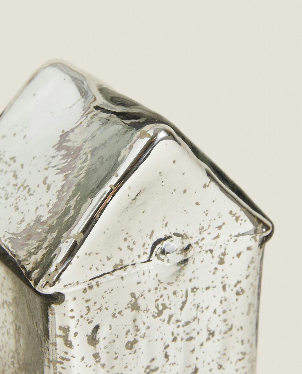 Decorative LED lamp, made of mercurised glass, in the shape of a little Christmas house.