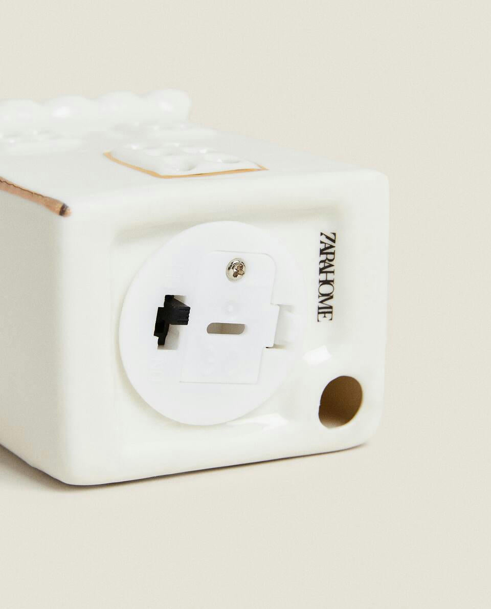 Ceramic Christmas decoration in the shape of a house with a light.