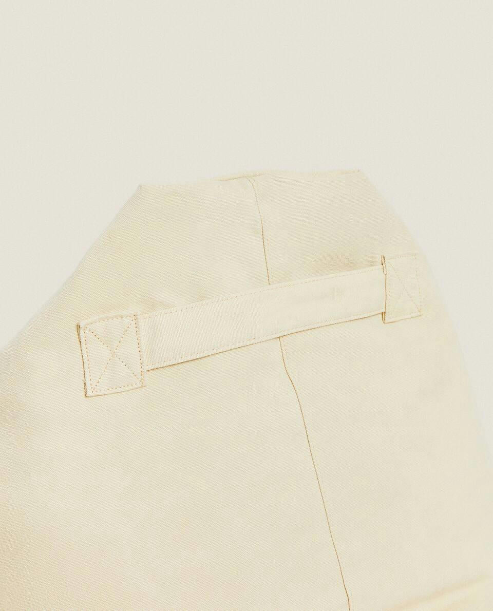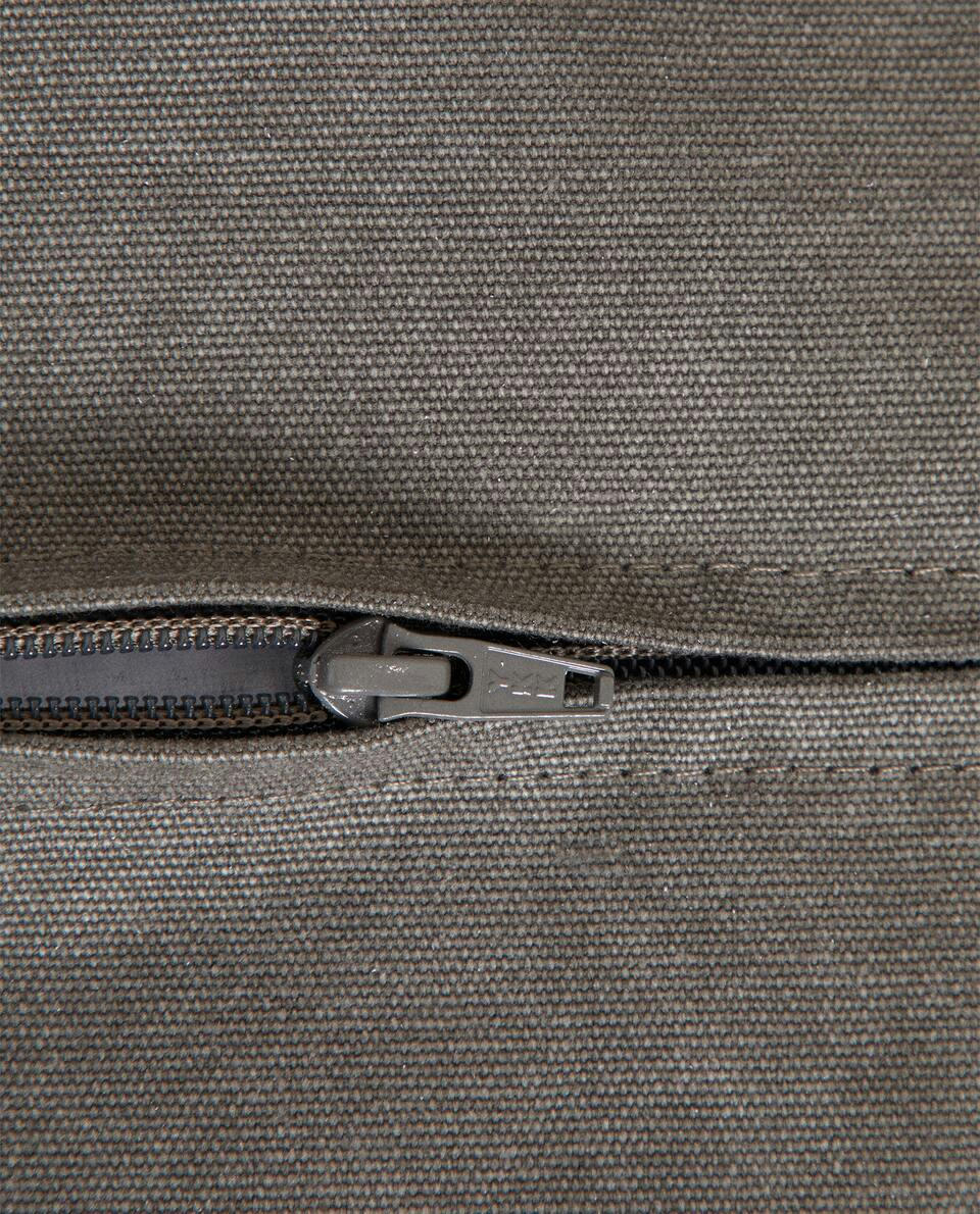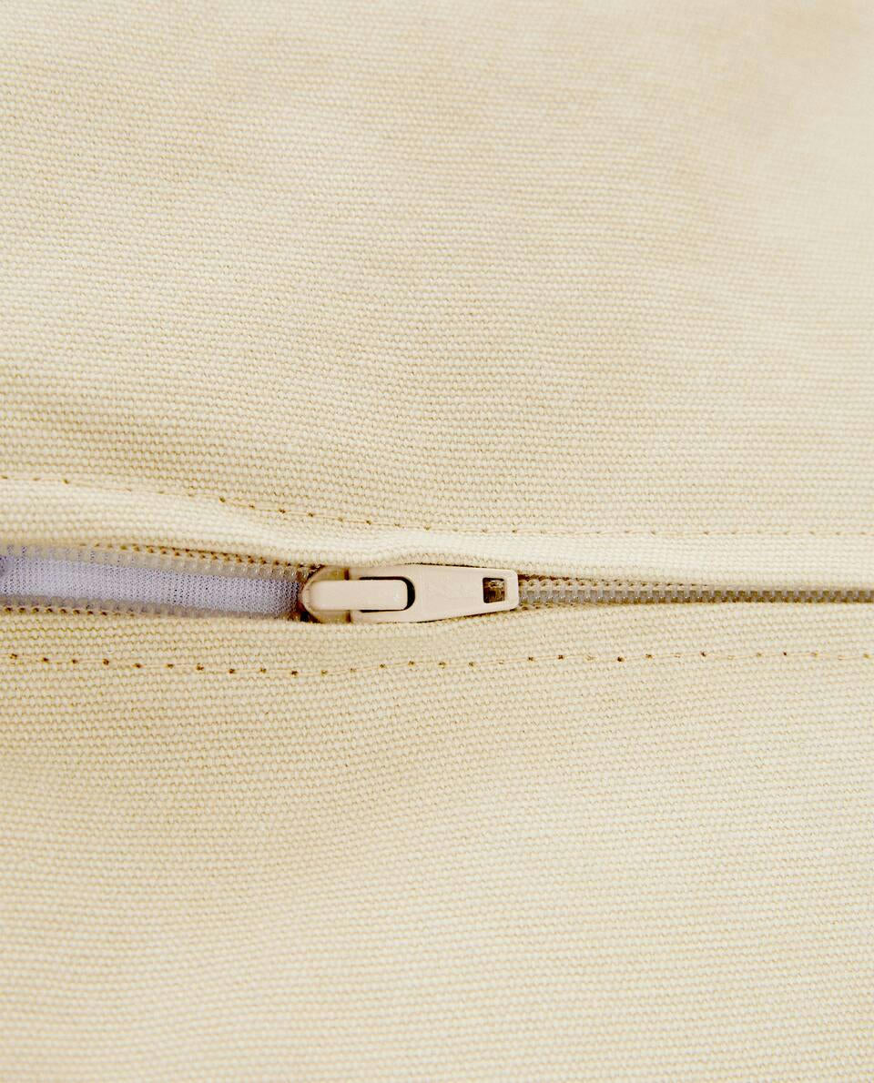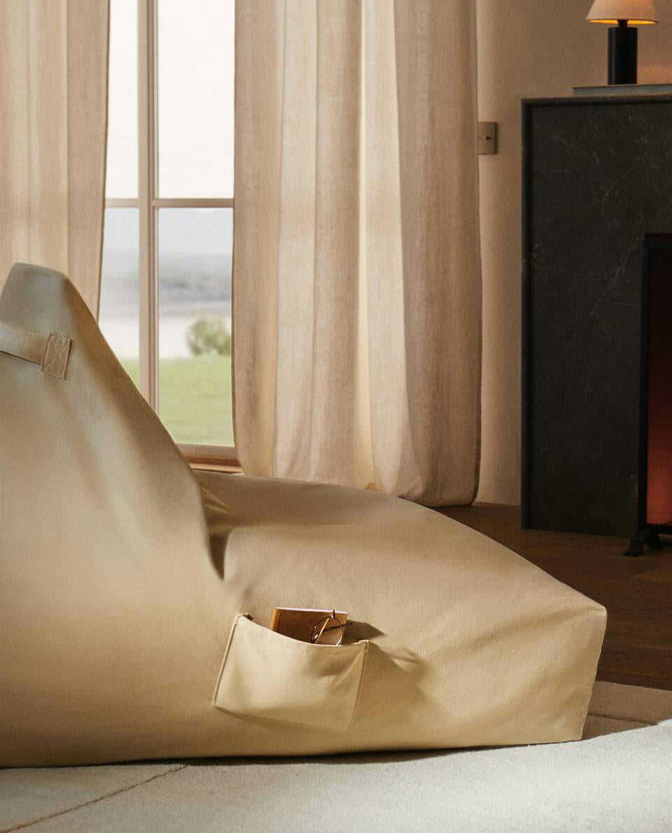 Large pouffe with a cotton cover, handle and pocket. The cover can be removed.