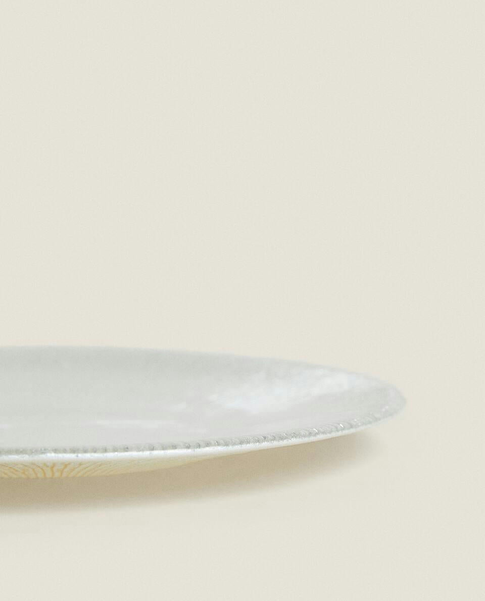 Round glass dessert plate with texture and glitter, for Christmas.