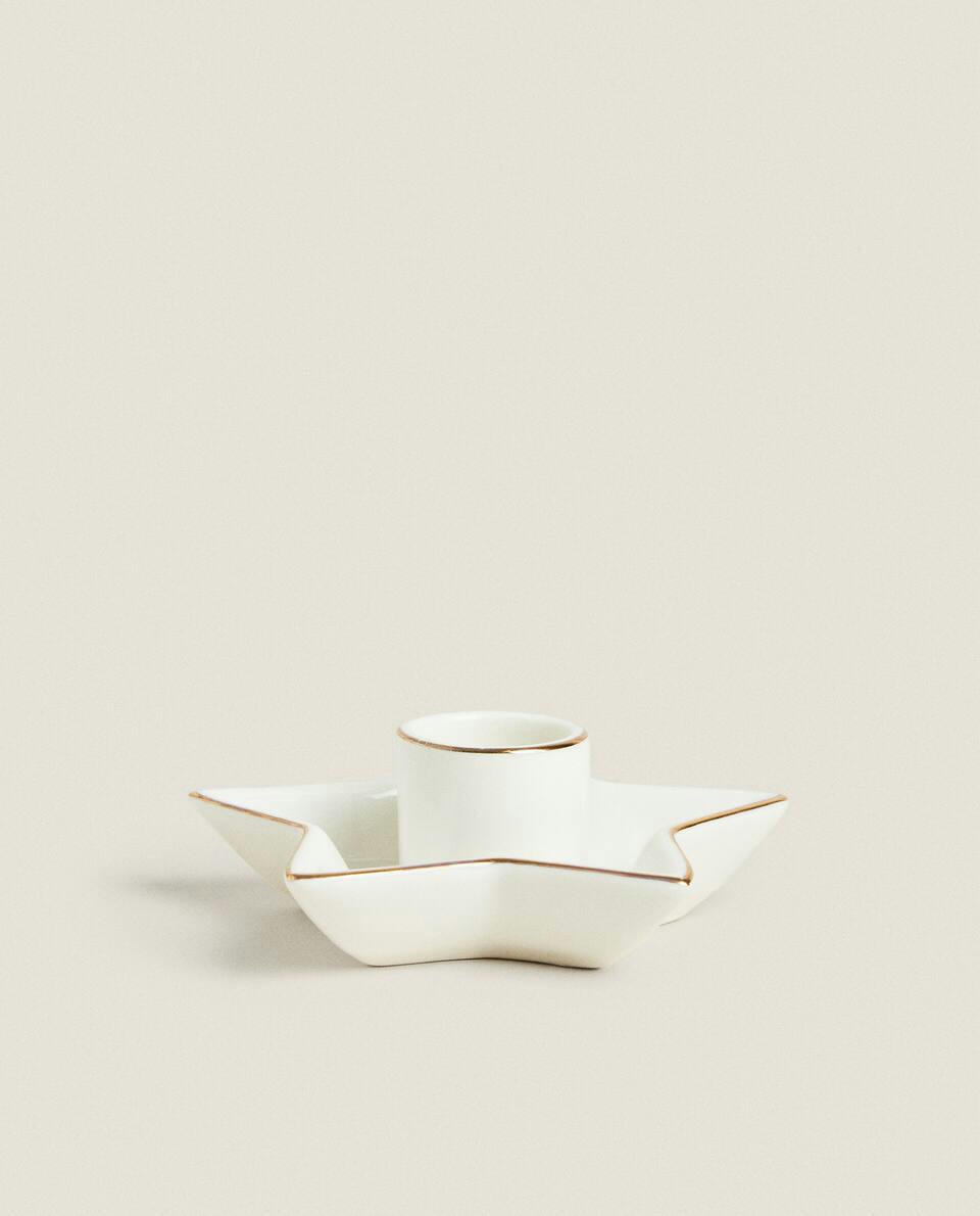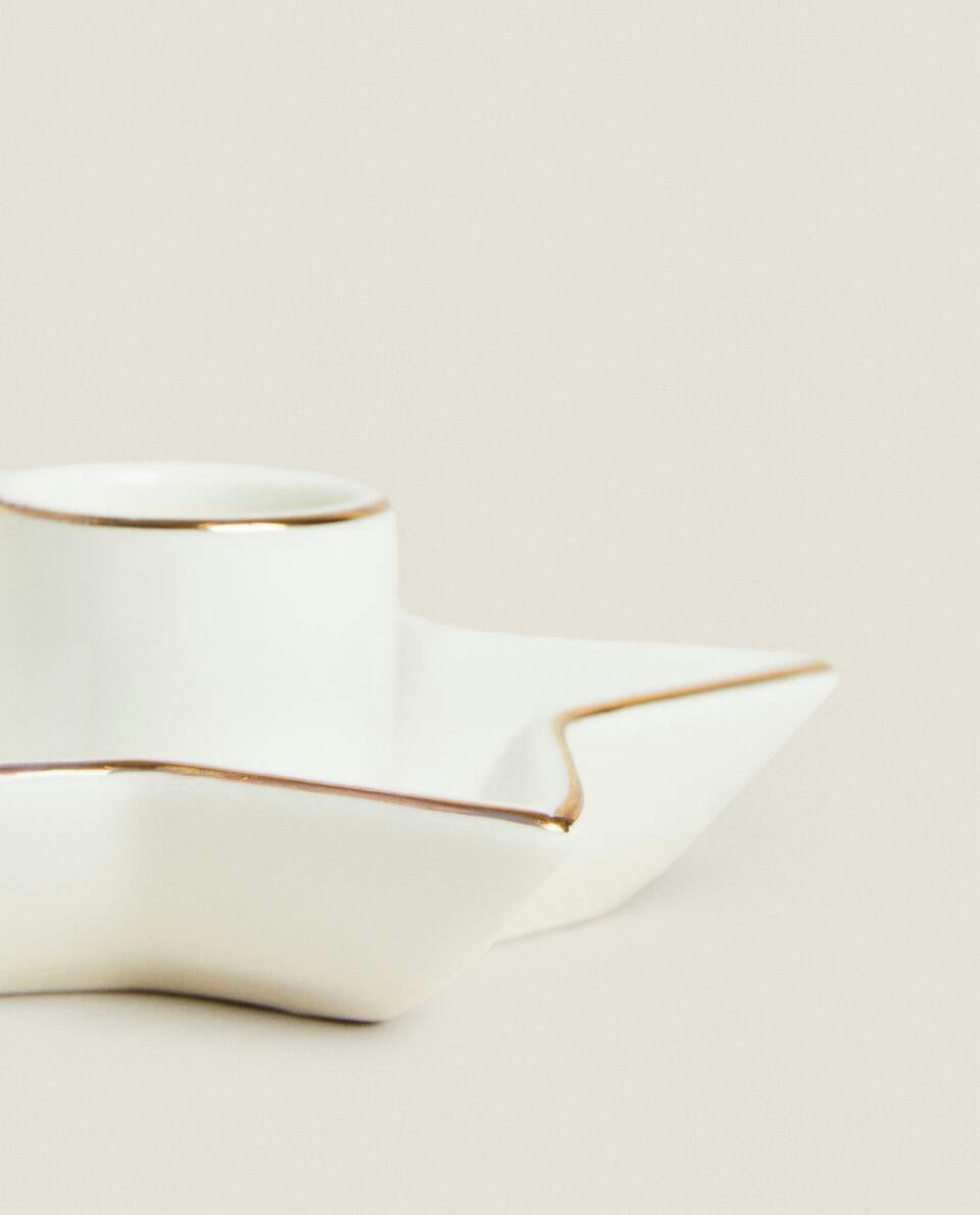 Porcelain candlestick, featuring a star-shaped base with a gold rim, for Christmas.