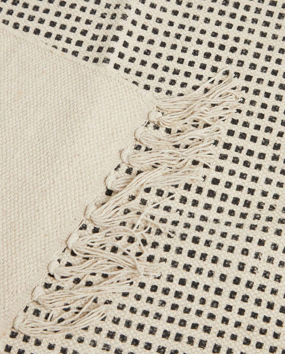 Lightweight rug featuring an all-over contrast print and fringed trim.